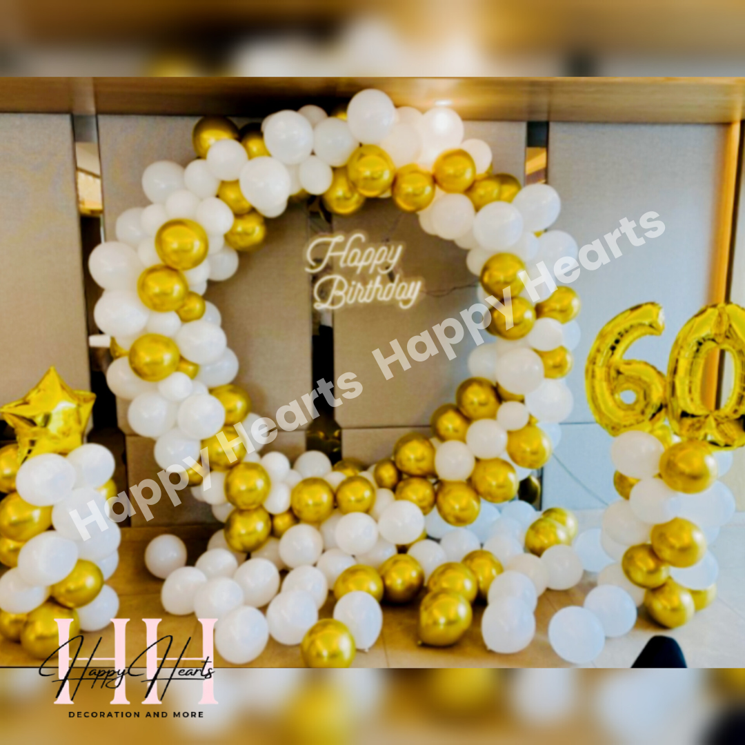 BALLOON DECORATION Ring stand (rented) Happy birthday neon light 250 Balloon normal white 100 golden chrome balloons 1 Star golden Age foil